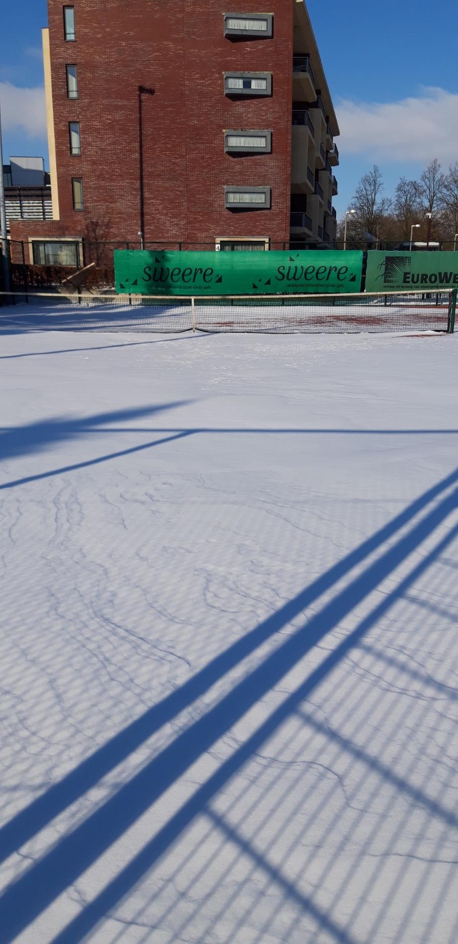 Zo ook niet als er sneeuw op de baan ligt. Vanzelfsprekend zou je zeggen, maar ook als de sneeuw aan het verdwijnen is, mag je niet altijd op de baan. Vaak is vanwege de lage temperatuur ook de ondergrond bevroren en kan het smeltwater niet goed afgevoerd worden zodat het tussen het tapijt en de onderlaag blijft zitten. Ga je dan toch de baan op, dan is het risico dat de onderlaag wordt ingetrapt en er deuken in de baan komen.